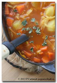 Gör så här:Skala morötter och potatis. Skär potatisarna i stora bitar och morötterna i slantar. Skölj purjolöken och skiva den. Finhacka vitlöken. Strimla vitkålen. Hetta upp oljan i en stor gryta och fräs lök, vitlök och kål tillsammans med curryn tills grönsakerna mjuknat. Rör ner morötter och potatis och tillsätt därefter vatten, buljong och kryddor. Koka upp och låt puttra tills morötter och potatis mjuknat, cirka 15-30 minuter beroende på bitarnas storlek och potatissort. Servera gärna med ett gott bröd. ![]() Kommentar av